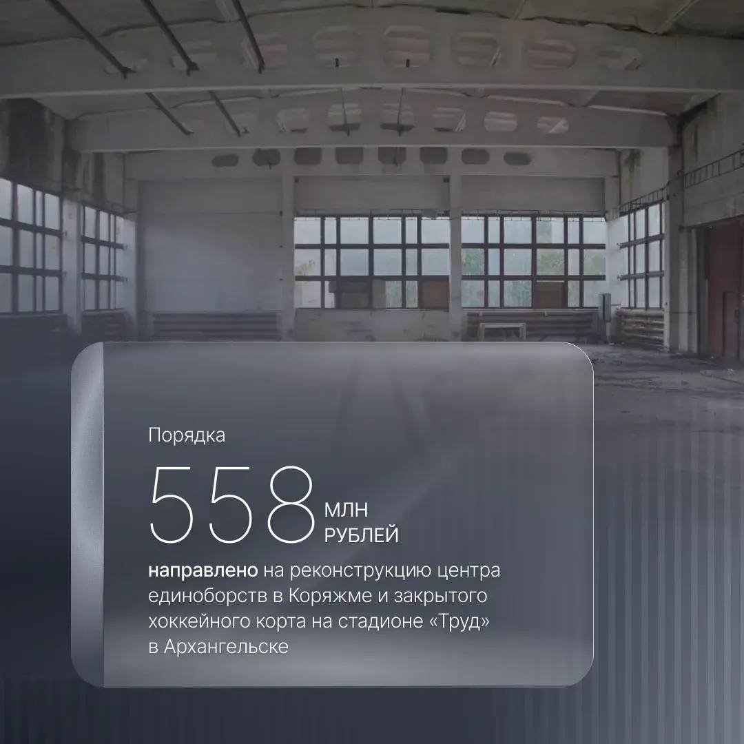 В этом году начинаем реконструкцию двух важных спортивных объектов: центра единоборств в Коряжме и закрытого хоккейного корта на стадионе «Труд» в Архангельске. Оба проекта получили поддержку из федерального бюджета, общий объем финансирования – около 558 млн рублей.