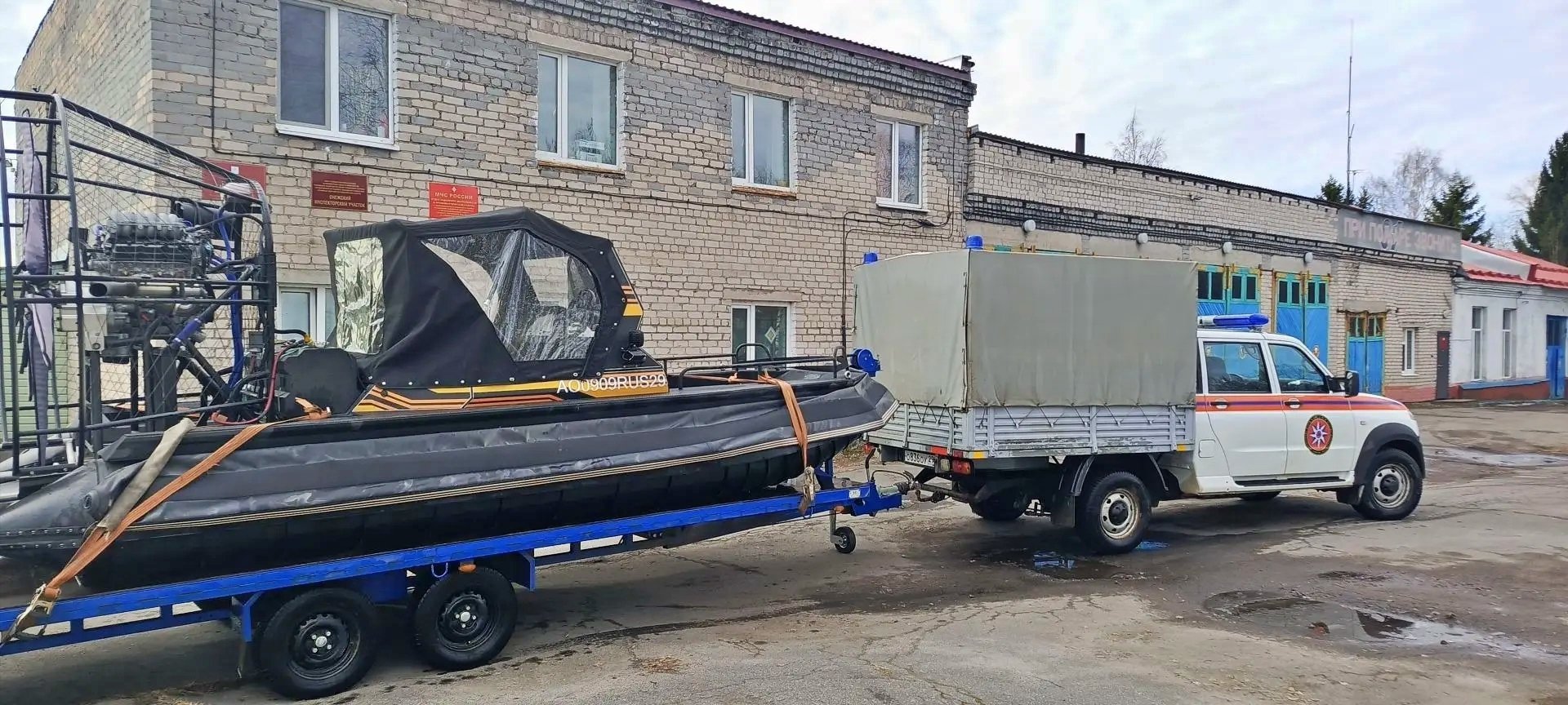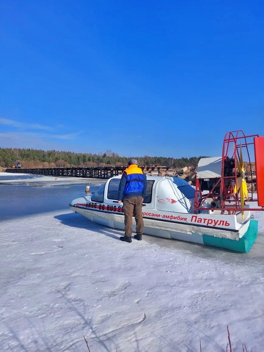 В период межсезонья спасатели областного Центра гражданской защиты организовали доставку жителей и важных грузов на заречные территории с использованием лодок на воздушной подушке.