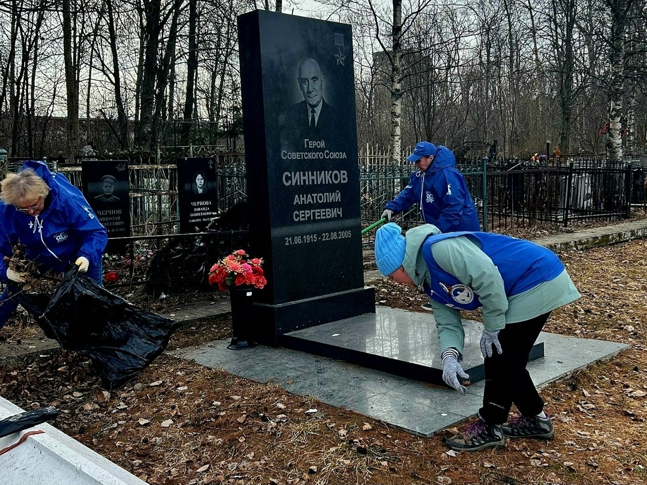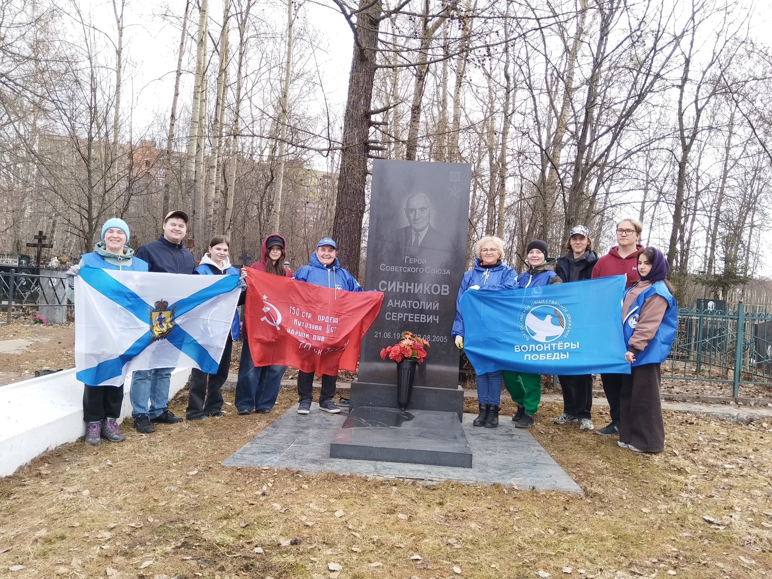 Одним из мест уборки стала территория у памятника Герою Советского Союза Анатолию Сергеевичу Синникову - последнему герою, который жил в Архангельске. Тому, кто под шквальным огнем переправлялся через Днепр, не думая о себе. Кто получил ранение, но не ушел с поля боя. А после войны стал учёным-лесоводом, спасал леса Родины.