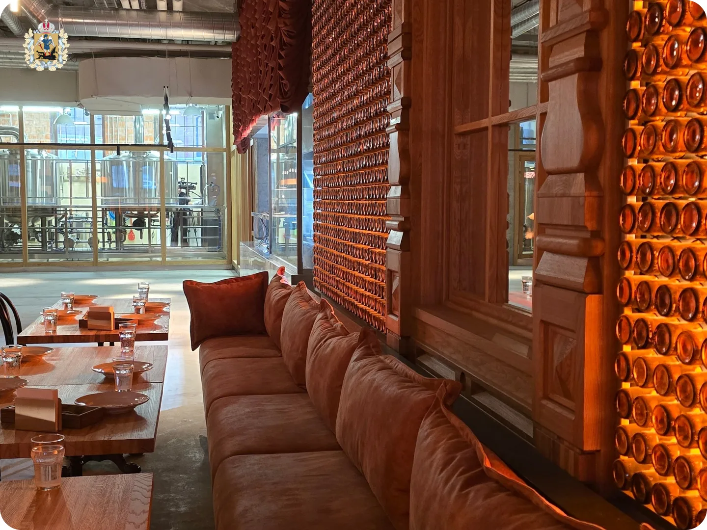 Ключевая ставка сделана на качество кухни и разнообразие формата. Пространство разделено на несколько зон: одна часть выполнена в стилистике классического бара, другая — ближе к ресторанному формату с сервировкой столов. Отдельно предусмотрена семейная зона с детской комнатой. С наступлением теплых дней во дворе комплекса откроется уличная терраса.