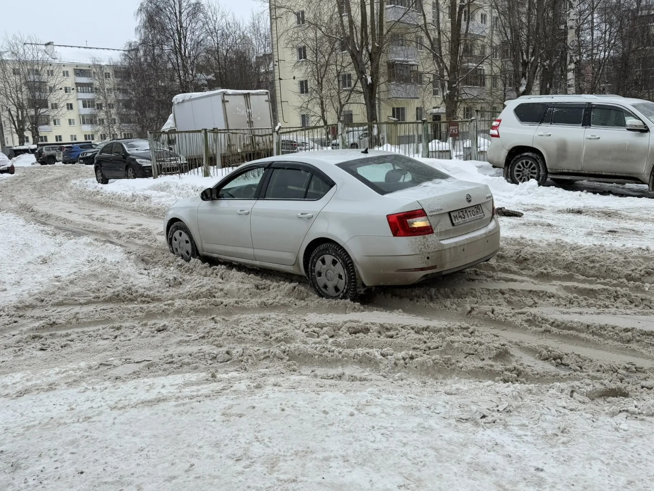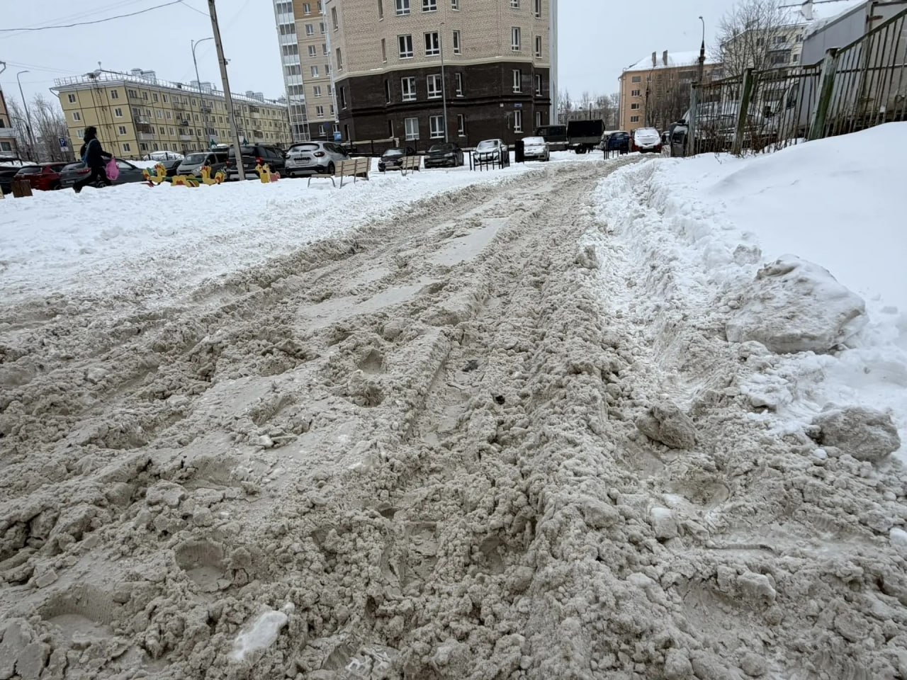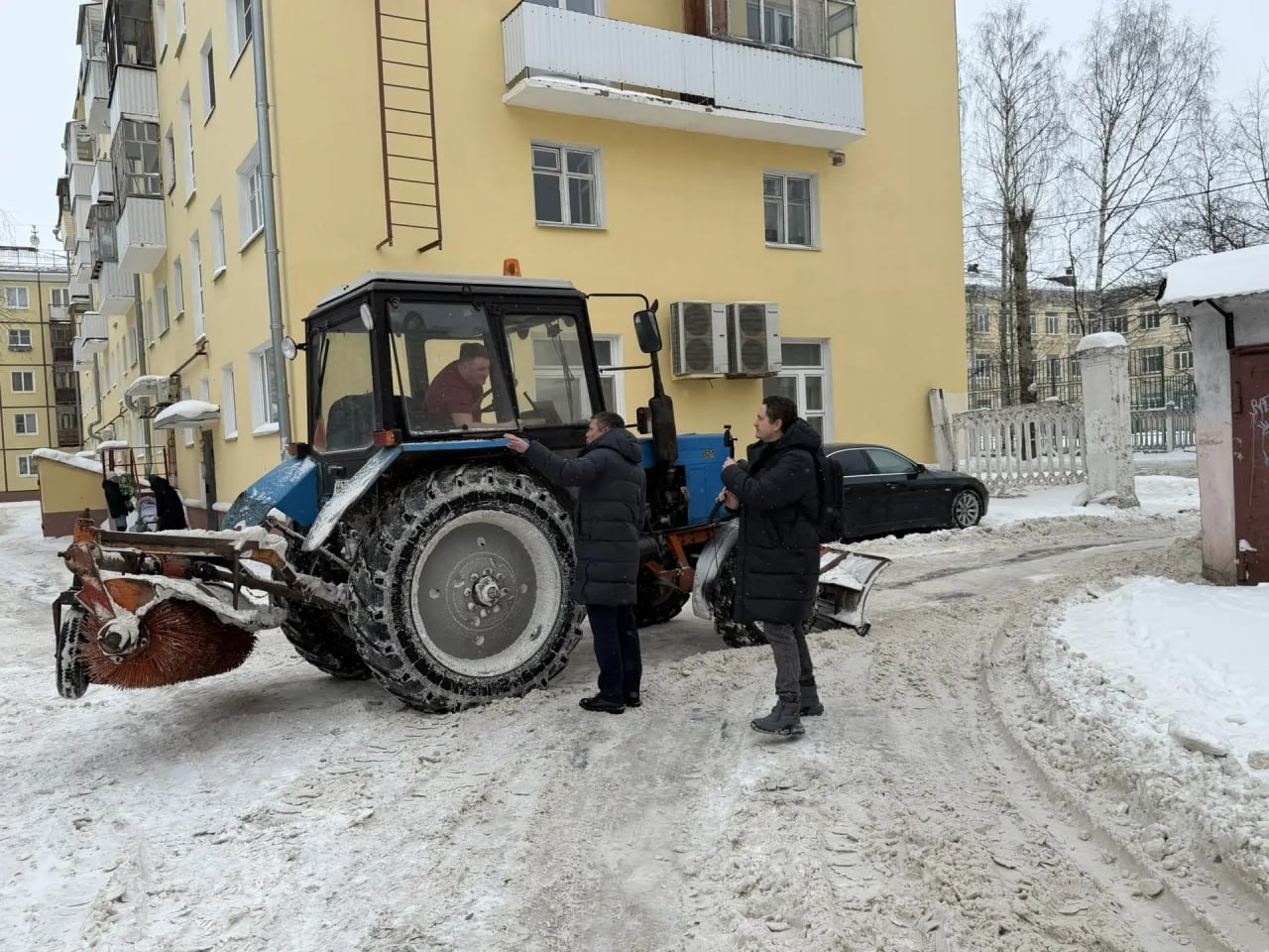 Со стороны соседних домов, где обслуживает территорию муниципальная управляющая компания «Созидание», увидели противоположную картину: во дворе работает техника, территория вычищена. Тракторист отметил, что объём работ действительно большой, но стараются работать по графику. Есть трудности с припаркованными машинами, однако УК старается взаимодействовать с жителями, чтобы обеспечивать проезд для техники.