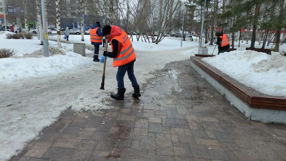 Для этого задействованы специальные машины-«ледоколы», которые убирают наледь с тротуаров. Там, где техника не может пройти, работы выполняются вручную.