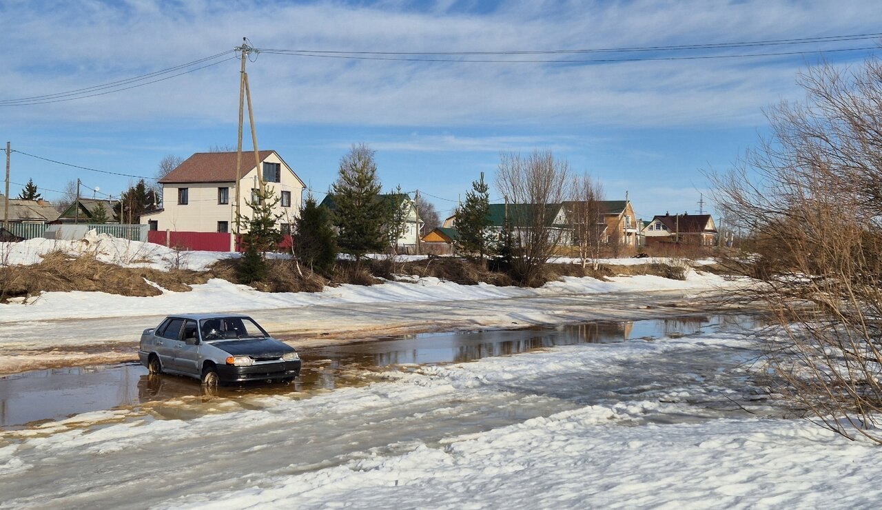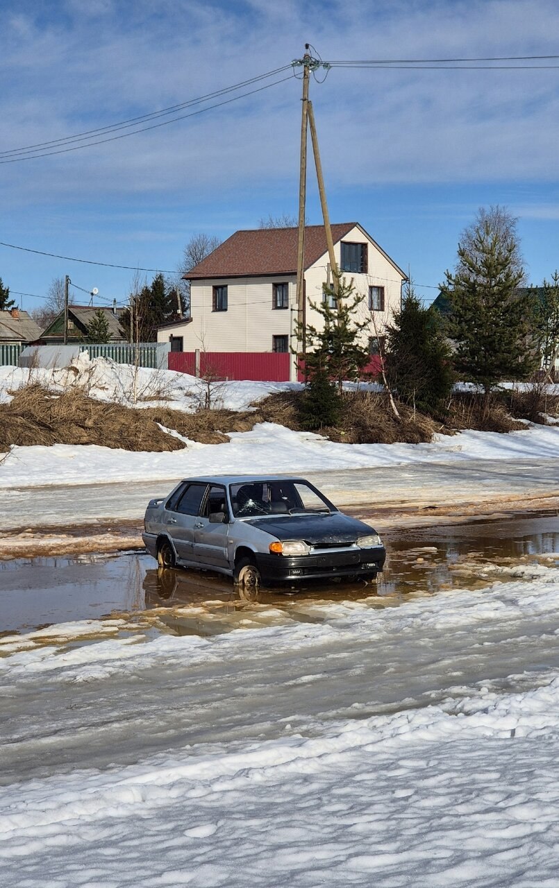 ВАЗ заметили на льду реки накануне. При этом официальных ледовых переправ через речку нет, проехать можно по мостам. Впрочем, это никого не остановило. Водитель выехал на лёд и застрял в месте активного таяния (и небольшого ручья).