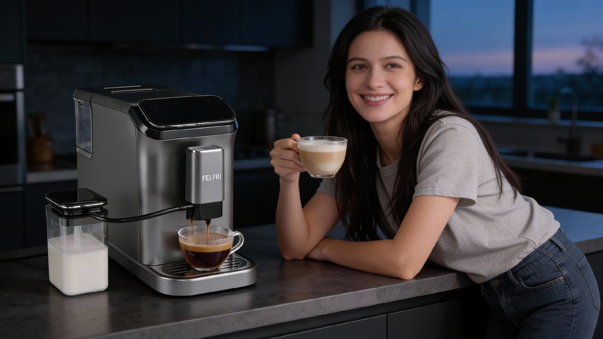 Кофемашина FELFRI FCM-006 предлагает удобные функции автоматической очистки и управления через мобильное приложение. Это значительно облегчает процесс обслуживания и делает его предсказуемым. К машине в комплект входит 0,75-литровая емкость для молока и щеточка, что дополнительно снижает время на уход.