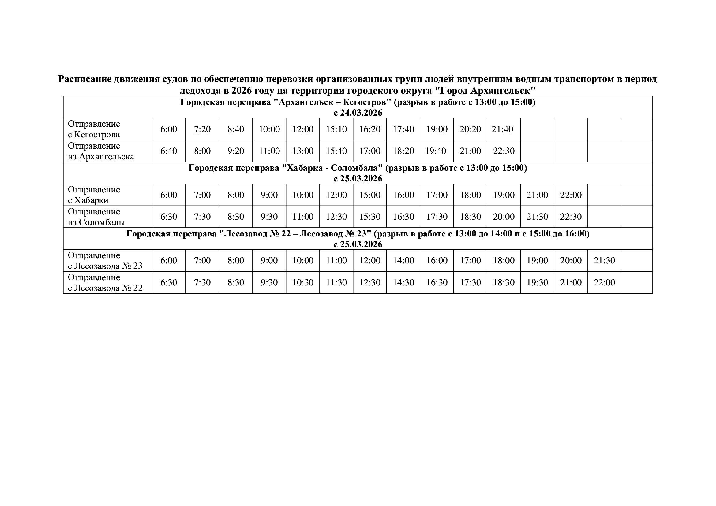Состоялся комиссионный осмотр ледовых переправ Соломбала-Хабарка и 22 Лесозавод – 23 Лесозавод. После обследования принято решение об их закрытии с 00:00 25 марта. Завтра, 25 марта, на линии по данным направлениям выйдут буксиры.