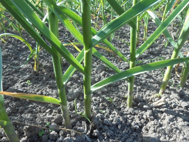 Чеснок негативно реагирует на переувлажнение, поэтому важно следить за поливом: в дождливое время лучше использовать водоотводные борозды, а в засуху поливать 1 раз в 5-7 дней. За три недели до уборки полив прекращают, чтобы головки не теряли лёжкость.