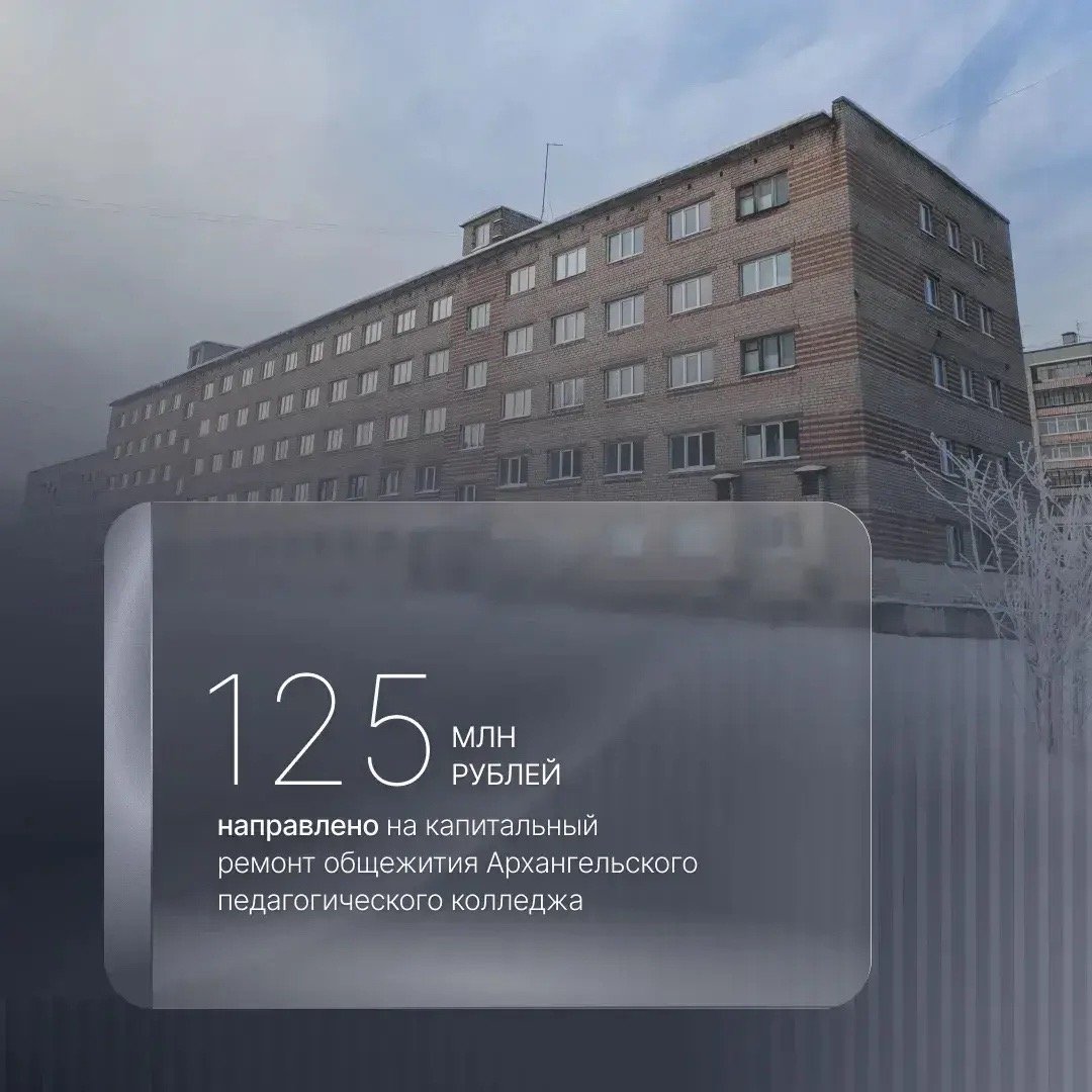 В 2026 году на капитальный ремонт общежития Архангельского педагогического колледжа выделено 125 миллионов рублей. Работы идут в рамках региональной программы модернизации учреждений СПО.
