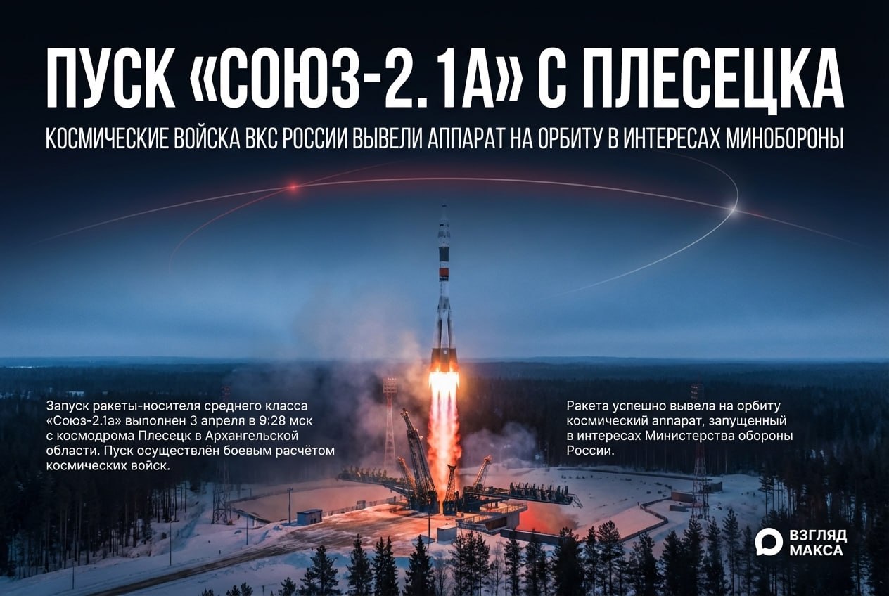 Космические войска Воздушно-космических сил России 3 апреля провели успешный пуск ракеты-носителя среднего класса «Союз-2.1а» с космодрома Плесецк в Архангельской области. Об этом сообщили в Минобороны России. Запуск был выполнен в 9:28 мск боевым расчётом космических войск. Ракета вывела на орбиту космический аппарат, который запущен в интересах Министерства обороны России.