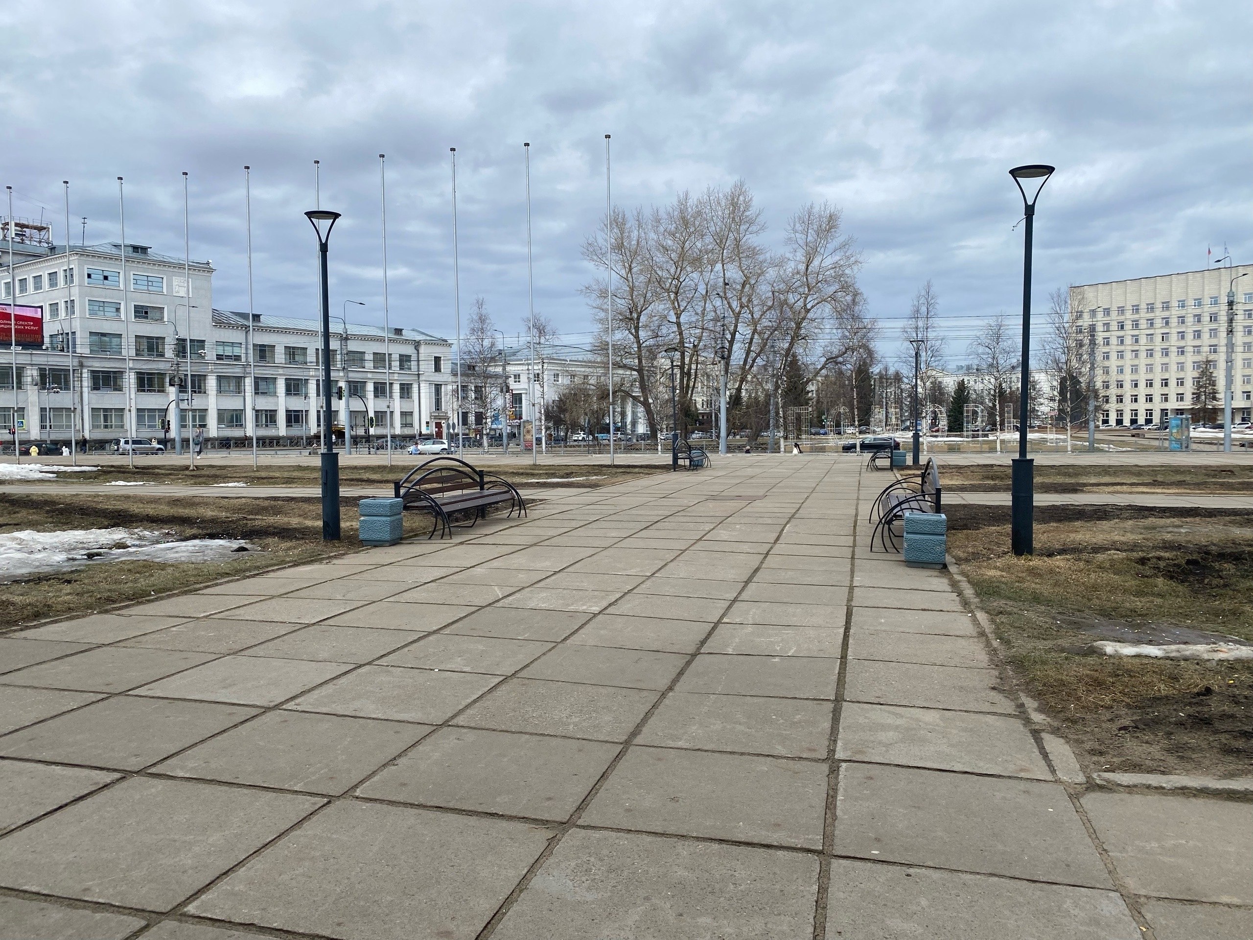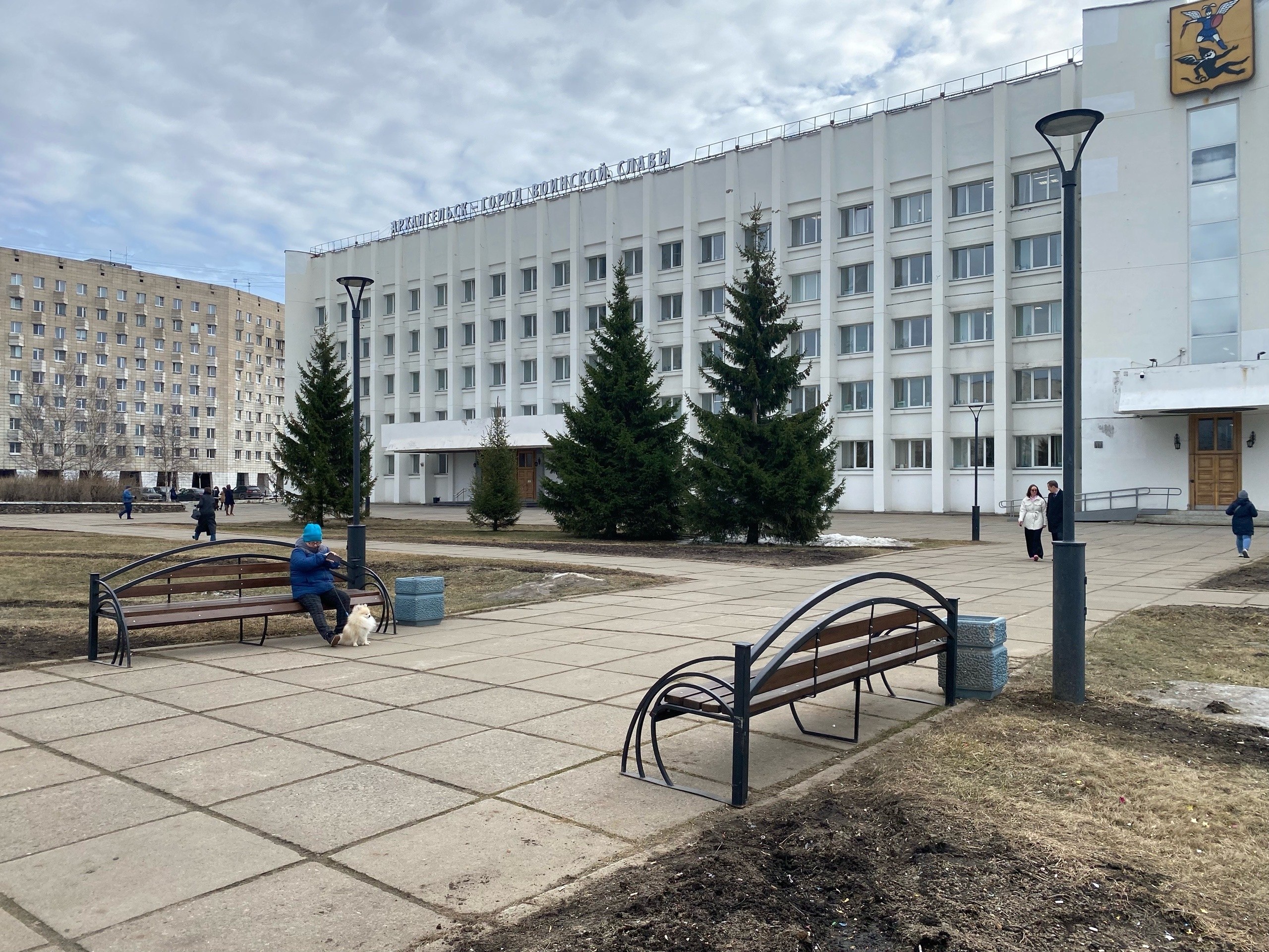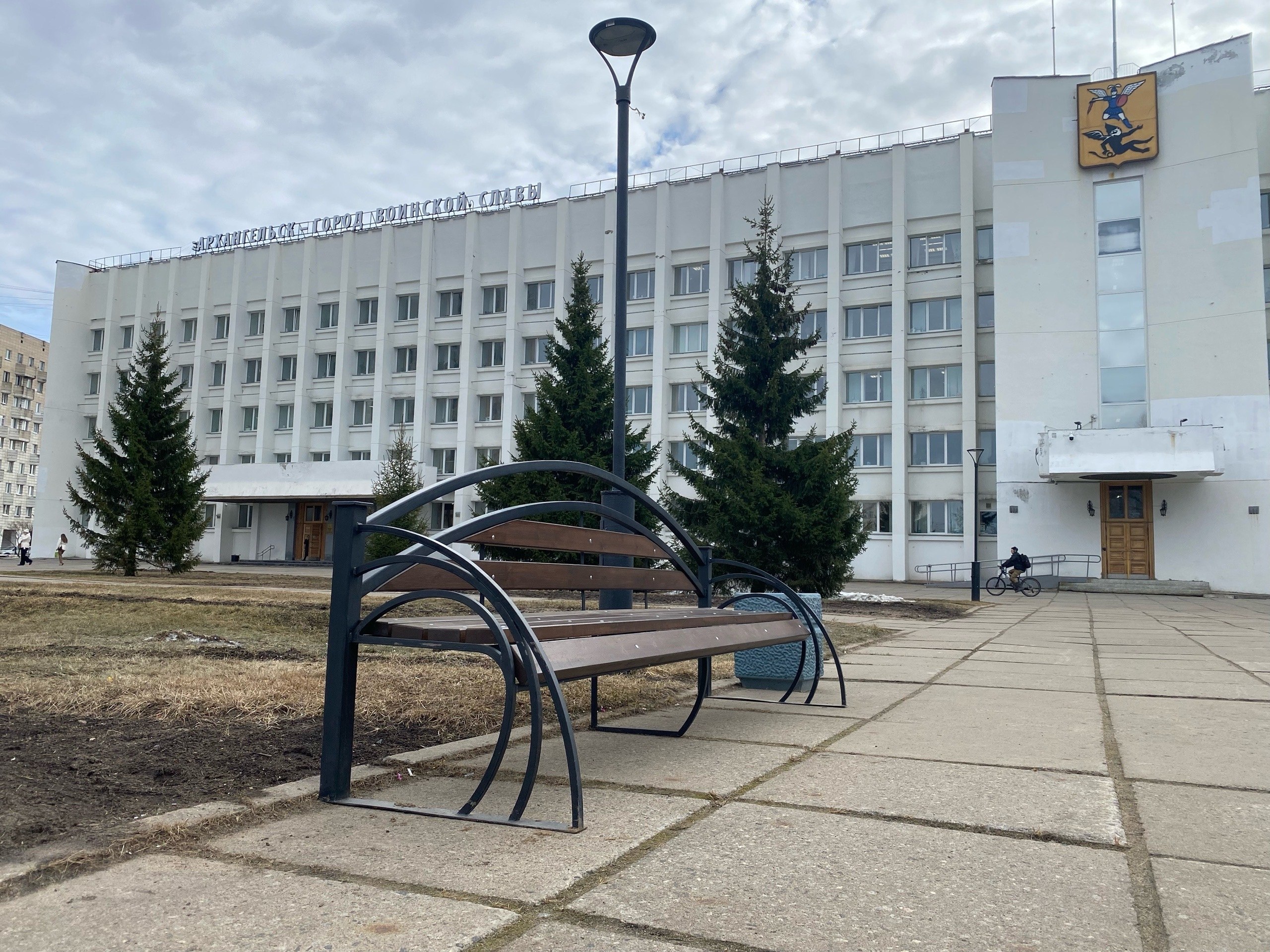 Четыре скамейки и урны установили на площади напротив здания администрации Архангельска. Малые архитектурные формы убирали на зимний период для обеспечения качественной уборки снега.