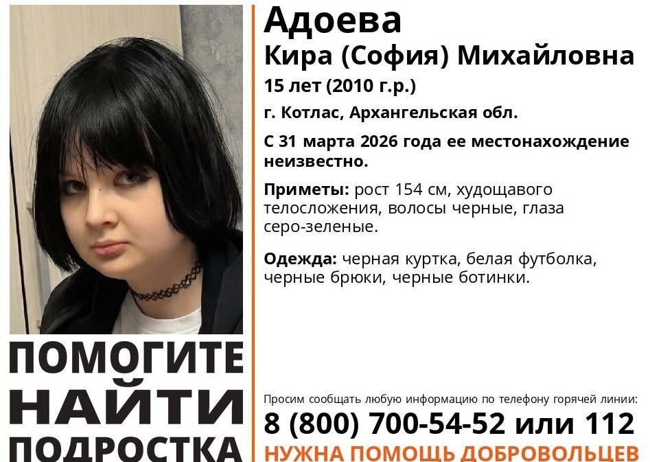 Пропавшая в Котласе школьница до сих пор не найдена Кира (София) Адоева, 15 лет, пропала в городе Котлас 31 марта 2026 года. До сих пор её местонахождение неизвестно.