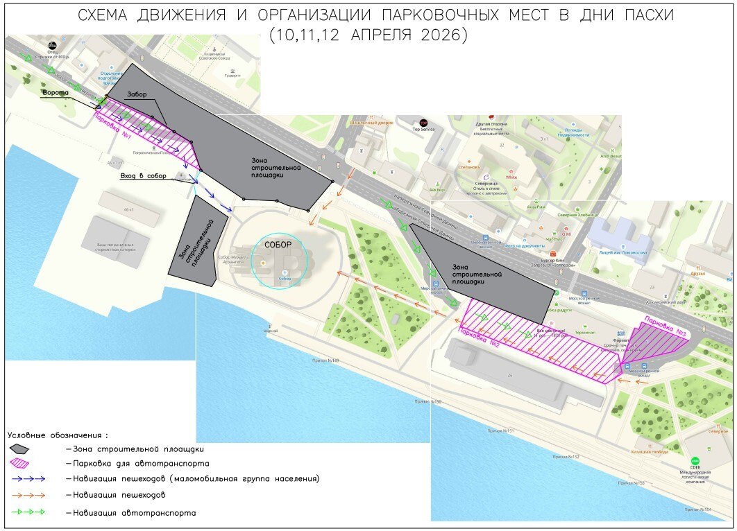 В связи с большим количеством желающих посетить собор на площади Профсоюзов будут организованы дополнительные парковки. 10, 11 и 12 апреля оставить автомобиль можно будет в трёх местах: у здания пограничного управления, напротив МРВ, а также сбоку от ТЦ «Терминал». Доступ на территорию собора будет открыт с трёх сторон.