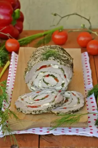 Следующий этап — укладка начинки. На ребро свинины равномерно распределить размороженный шпинат или свежую зелень. Сверху выложить нарезанный полосками болгарский перец и кусочки сыра фета. После этого аккуратно свернуть рулет и перевязать его нитками, либо зафиксировать в специальной сетке.
