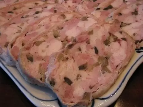 Далее раскройте куриную кожу на пленке, чтобы она напоминала прямоугольник. В центр формы выложите мясную смесь и аккуратно заверните её в кожу. Перенесите получившийся рулет на смазанную растительным маслом фольгу и заверните. Для удобства можно поместить ветчину в форму для запекания, чтобы она сохраняла свою форму. Уплотните руками и запекайте в предварительно разогретой духовке при температуре 180-200°C в течение 1-1,5 часов.
