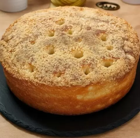 После повторного подъёма теста на его поверхности делают углубления с помощью смоченной в растительном масле палочки. Углубления заполняются заранее приготовленной посыпкой, а затем пирог помещается в предварительно разогретую духовку на 25 минут при температуре 180°C. Когда пирог готов, его поливают сливками и ставят обратно в духовку на 10 минут.