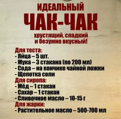 Для начала, соберите необходимые продукты. Вам понадобятся яйца, сода, соль и мука — все это станет основой для теста. Не забудьте про мед и сахар, которые придадут чак-чу его фирменный сладкий вкус.