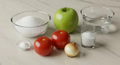 - Яблоки (250 г): Специальный секретный ингредиент, который придаёт кетчупу легкую кислинку и густоту. Рекомендуются кисло-сладкие сорта.