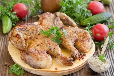 - В духовке: Этот метод идеален для тех, кто хочет снизить калорийность блюда. Смажьте цыпленка оливковым маслом и приправами, затем запекайте под грузом для достижения эффекта пресса.