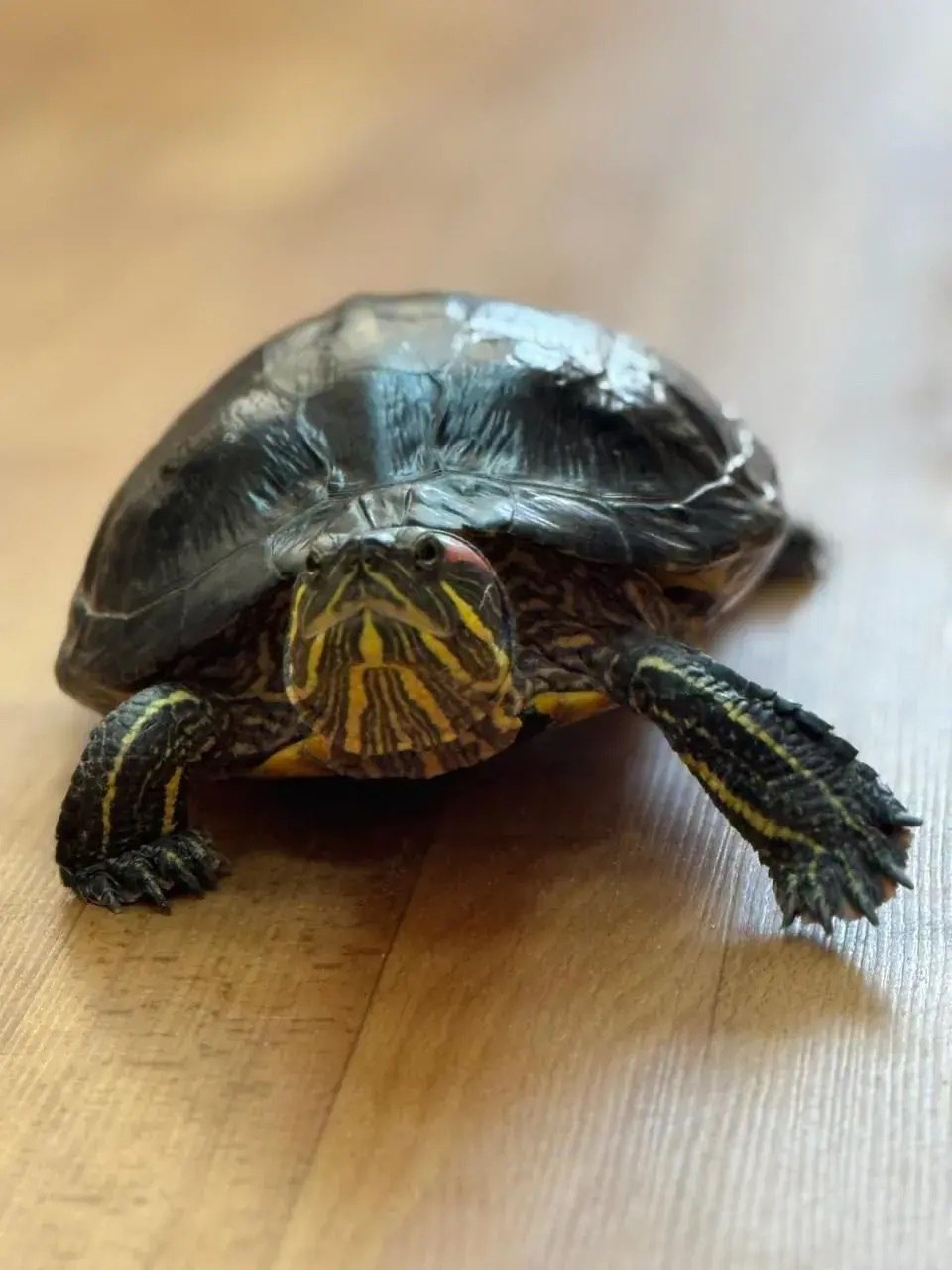 У всеобщей любимицы есть все для комфортной жизни: просторный аквариум, где организовано место для купания и островок где она греется на суше.