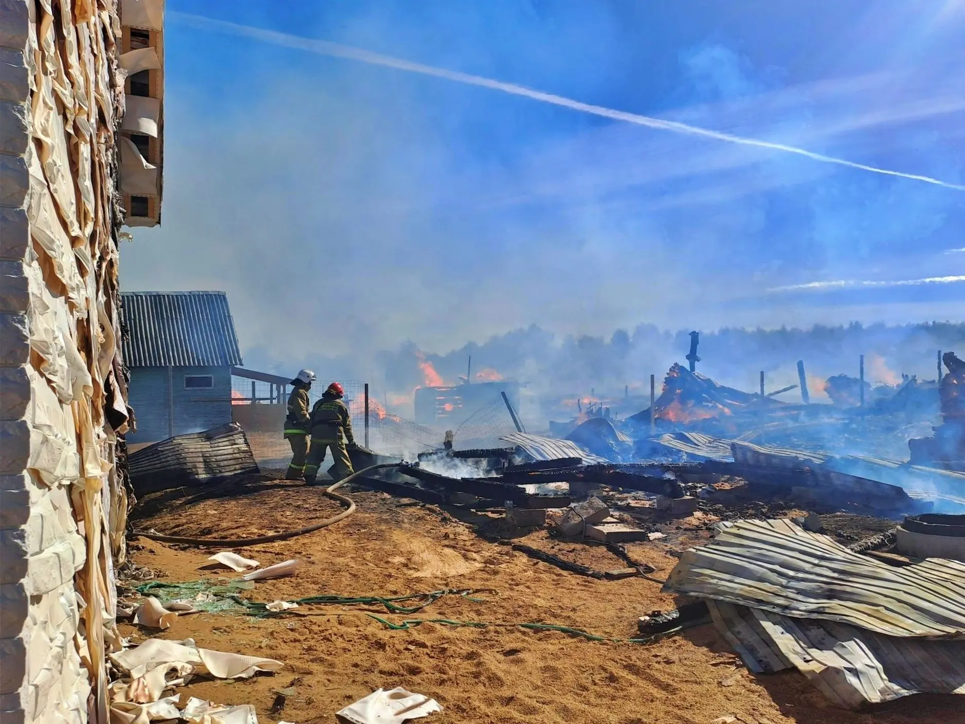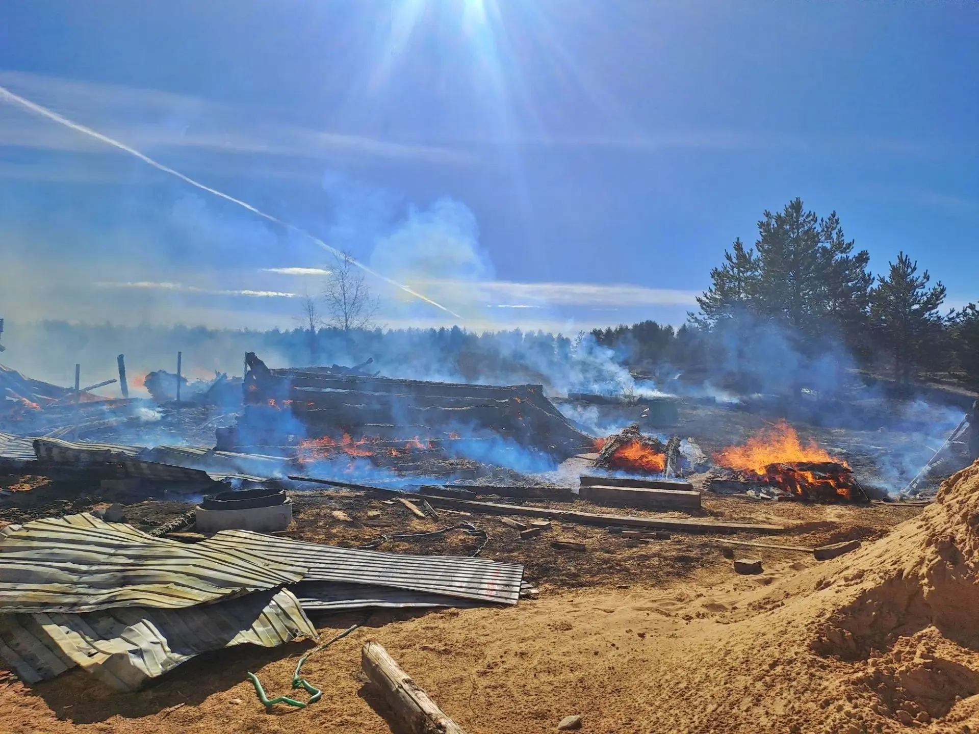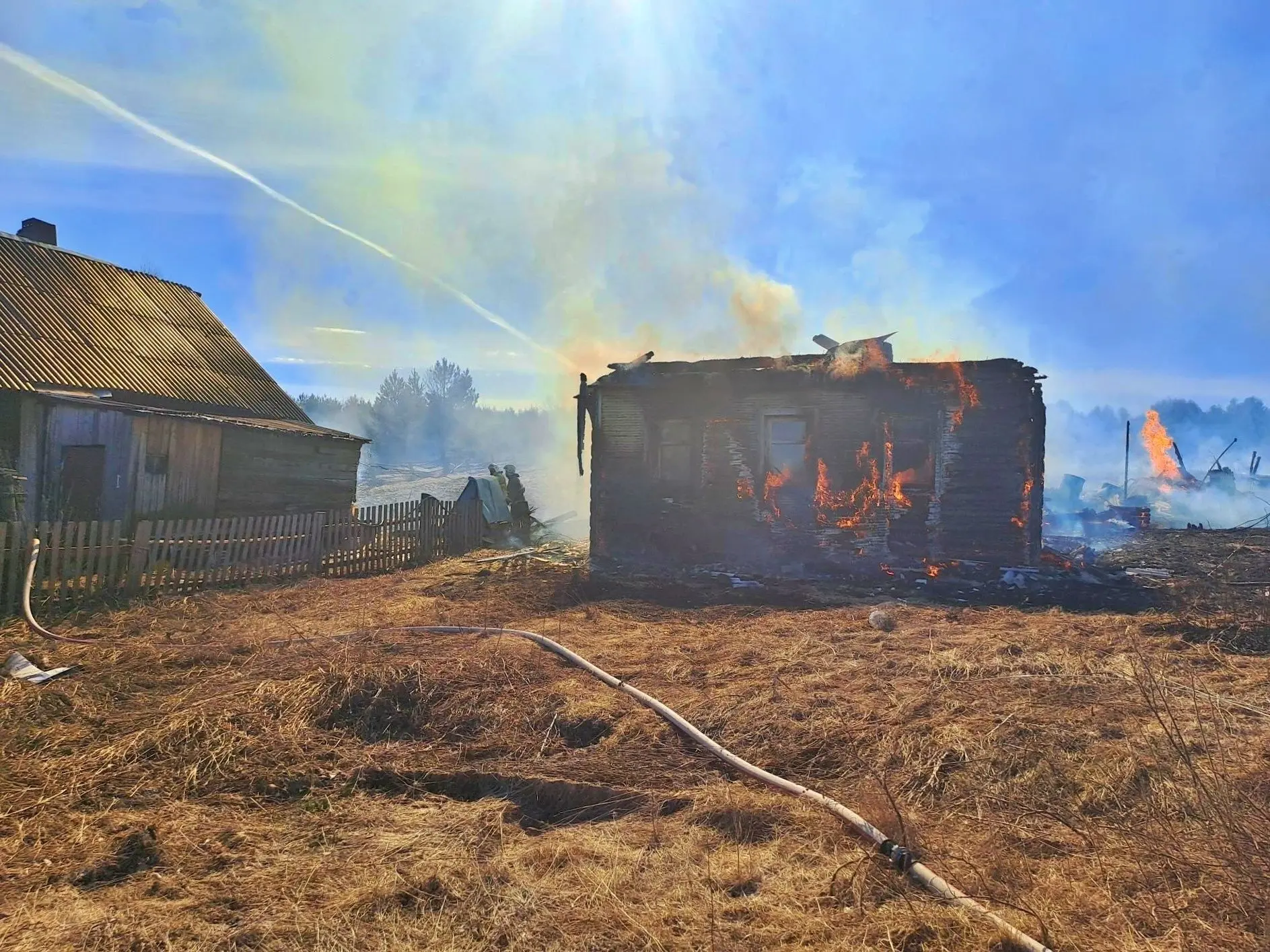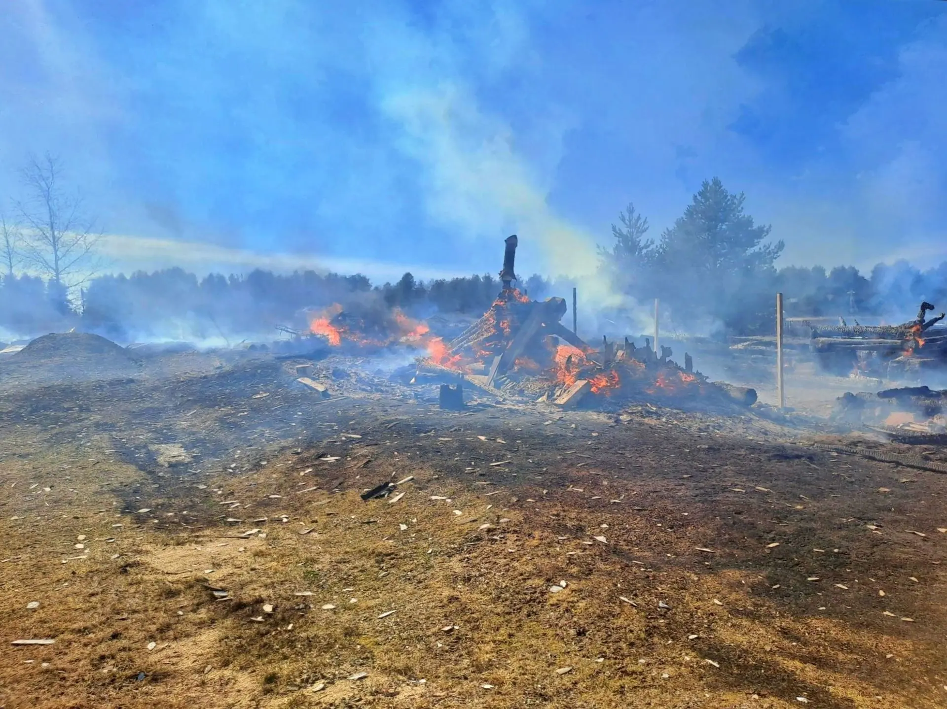 В результате огонь уничтожил частный дом, четыре бани и шесть хозяйственных построек. Общая площадь пожара – 800 квадратных метров. Пострадавших нет. Причину пожара предстоит вяснить