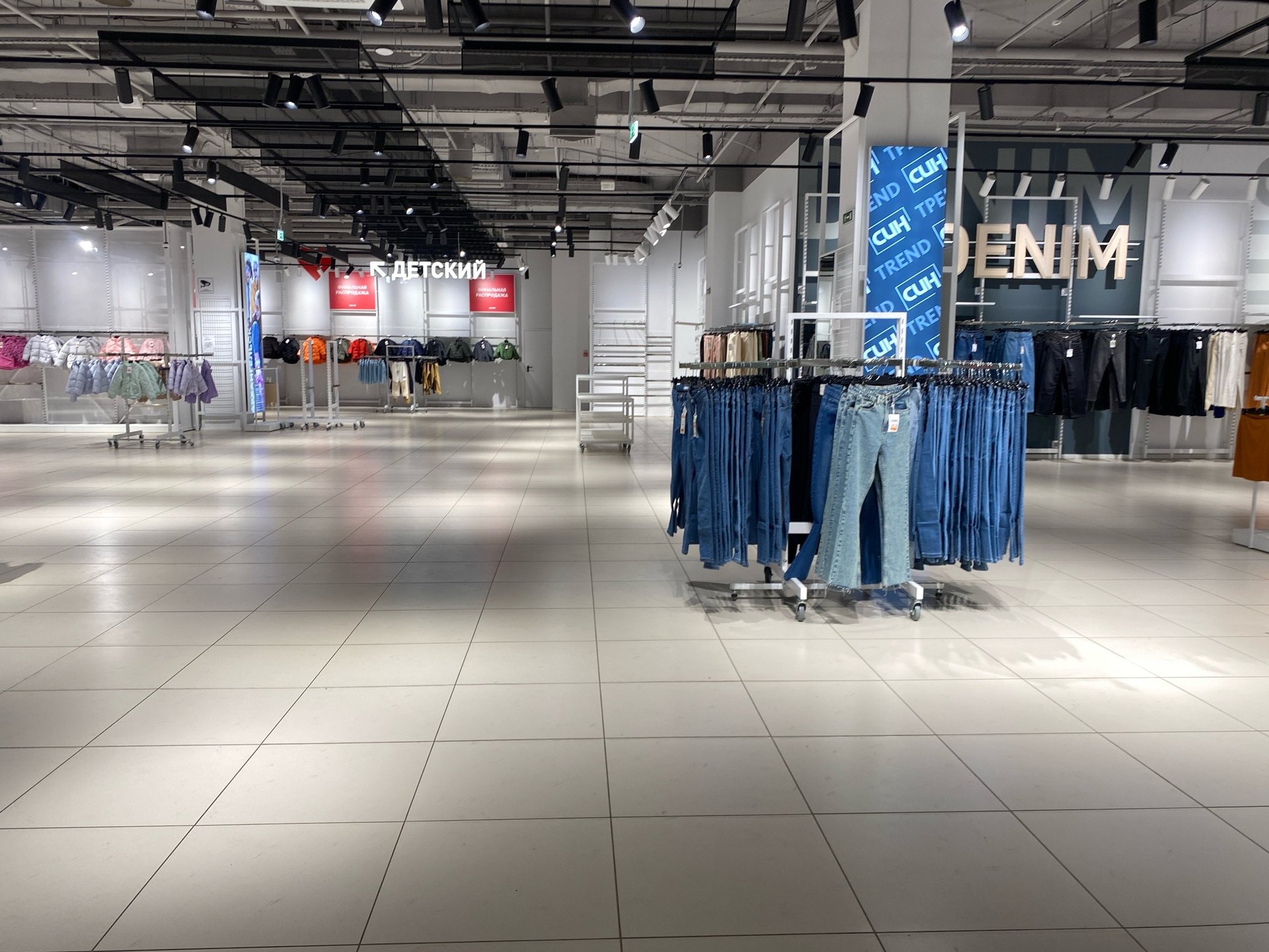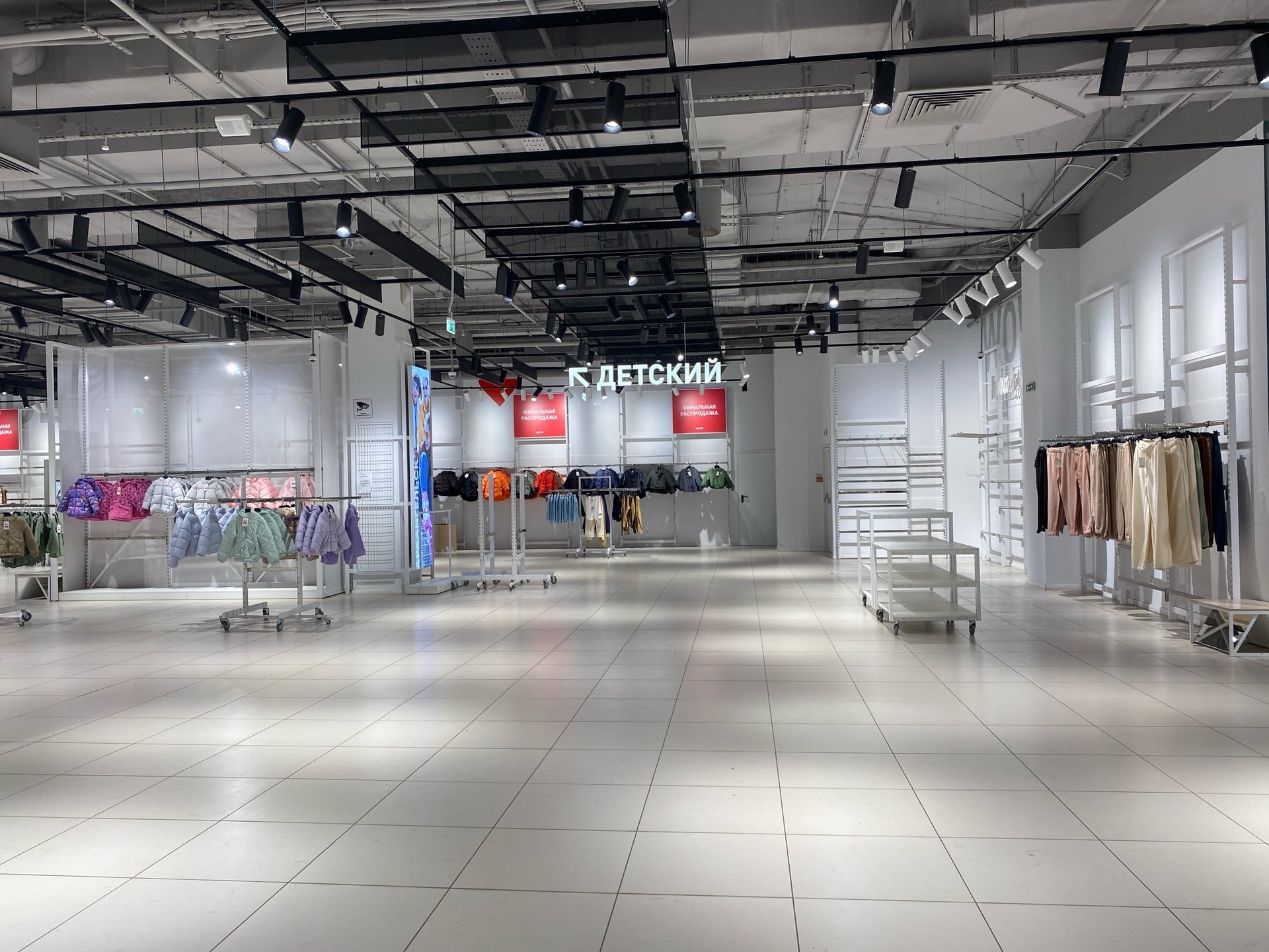 Речь об отделе одежды и товаров для дома в одном из торговых центров города. Сейчас там почти пустые прилавки, продавцы упаковывают остатки товара в коробки.