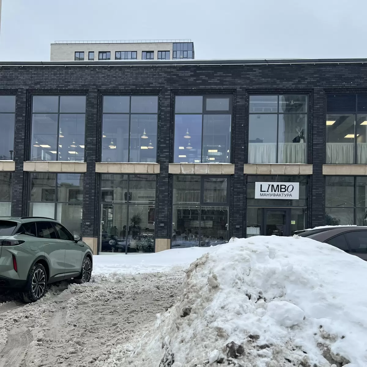 Здание, выделяющееся на фоне окружающих улиц, выполнено из серого декоративного кирпича и больших окон, что создает впечатление уютного и современного пространства. Внутри заведения царит живое движение: светло, много цемента и яркие детали.