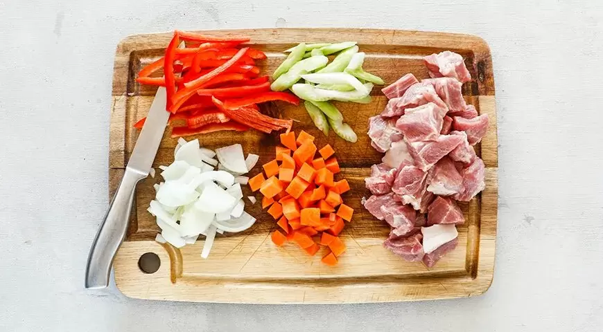 1. Подготовительная работа: свинину нарезать небольшими кубиками (2-3 см), лук — четвертинками колец, морковь — кубиками, сладкий перец — соломкой, а стебель сельдерея — ломтиками толщиной примерно 5-7 мм.