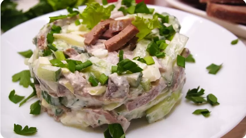 Во-первых, салат сытный благодаря основному ингредиенту – мясу. Во-вторых, свежий огурец добавляет летнего свежего оттенка и соковитости. В-третьих, заправка, основанная на сметане и горчице, придаёт интересный вкус без тяжёлого ощущения, которое иногда даёт майонез. Это именно тот случай, когда продукты гармонично сочетаются друг с другом. Такой салат можно смело готовить для семейного ужина или подать в шикарном салатнике, когда приходят гости.