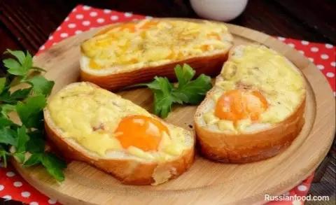 Приготовление начинается с подготовки хлеба: в каждом ломтике необходимо сделать небольшое отверстие, чтобы в дальнейшем удобно разместить яйца. Далее процесс следует выполнять в следующем порядке: