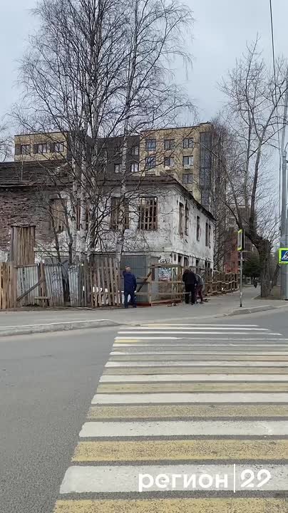 Здание бывшего трамвайного управления в центре Архангельска долгие годы стояло без присмотра. Забор разрушен, внутри — мусор, следы ночлега. Сейчас его обносят новым ограждением.