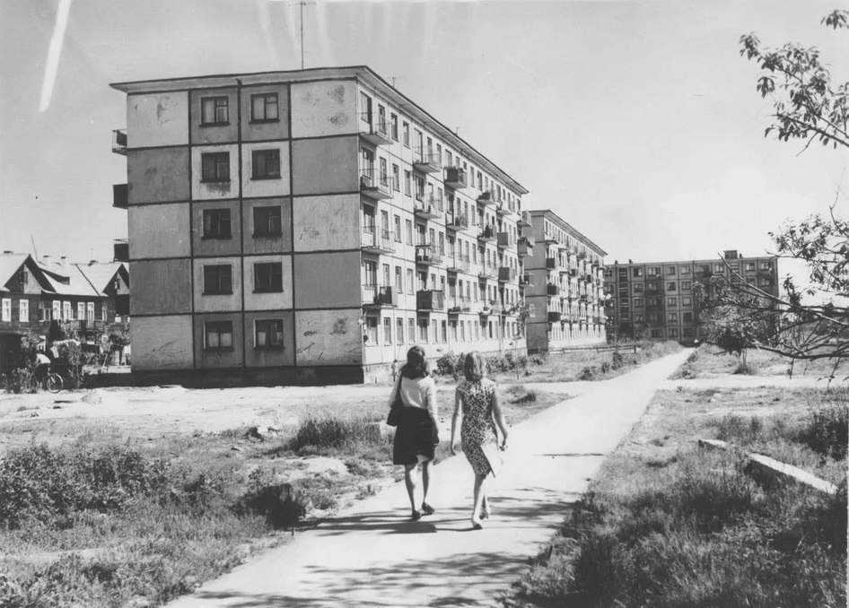 На летней фотографии 1967 года две девушки идут вдоль домов № 41 и № 43, построенных в 1964 году, на улице Комсомольской. Вдали виднеется еще одна классическая панельная "хрущевка" под номером 45. Она была построена в 1963 году. По бокам пешеходной дорожки подрастают деревья, около новостроек высажены кустарники.