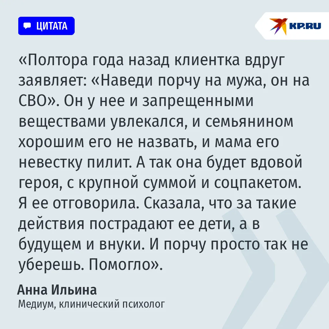 "Гадалка Валерия написала о том, что к ней обращались жены бойцов СВО - узнать, жив ли муж, - рассказала член СПЧ Марина Ахмедова. - Но скоро заметила, что некоторые (их немного) женщины расстраиваются, когда она говорит: "Жив. Ждите". И тогда некоторые из них стали просить Валерию сделать мужу... порчу на смерть!" Ведунья отправляет таких "клиенток" в бан. Сама Ахмедова посоветовала экстрасенсам призывать к решению вопроса таких женщин полицию. Но некоторые "специалисты" берутся за такие заказы.