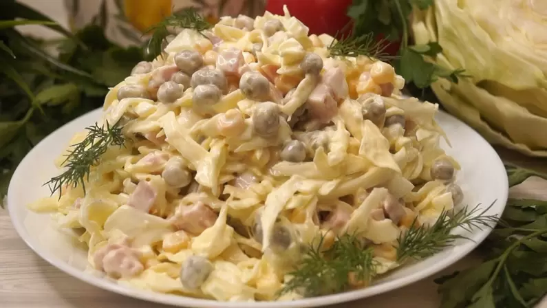 Этот салат с капустой, ветчиной и кукурузой станет отличным дополнением как к праздничному столу, так и к обычному ужину. Его быстрая подготовка займет всего лишь десять минут, что делает его идеальным вариантом для занятых вечерних часов.