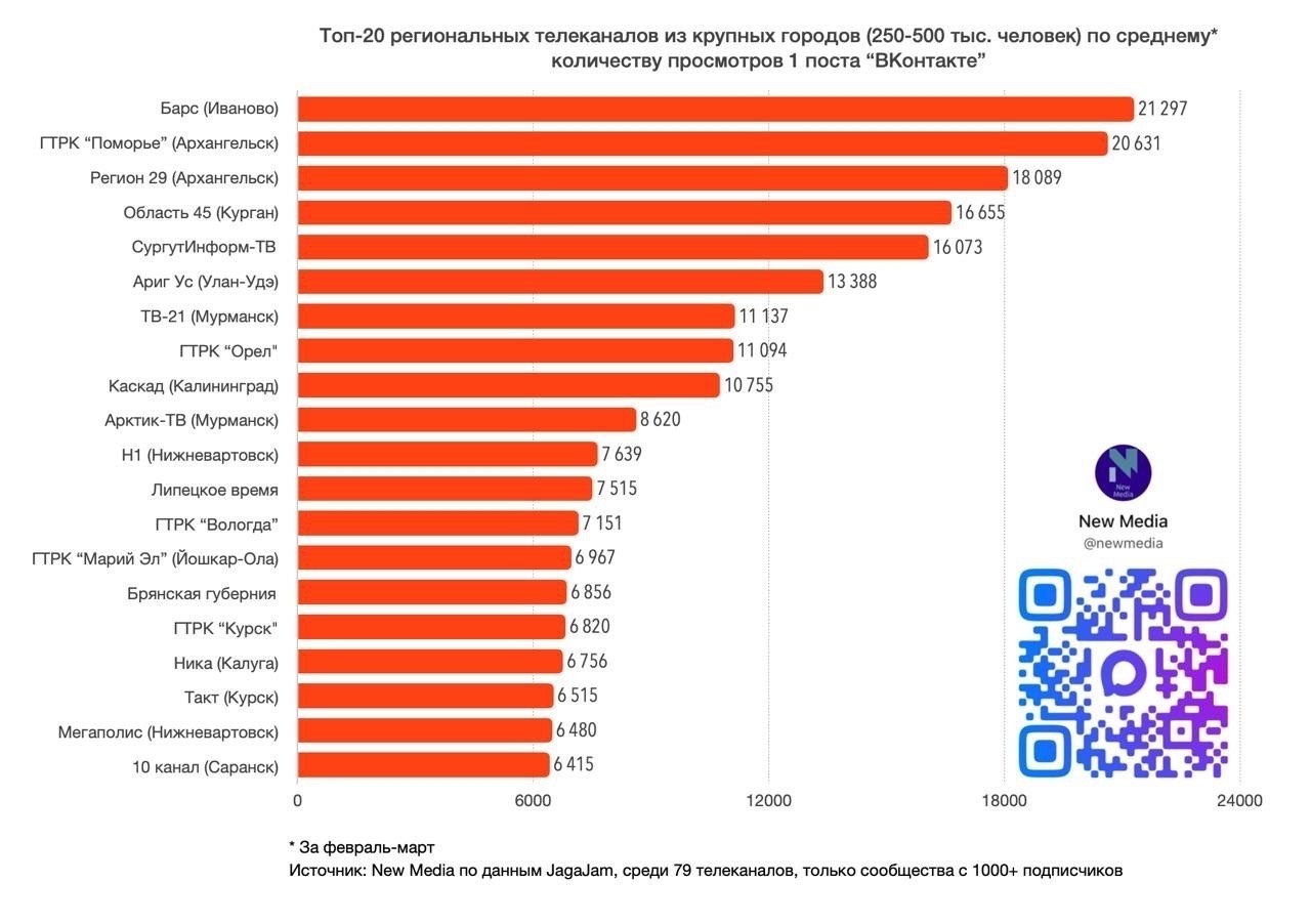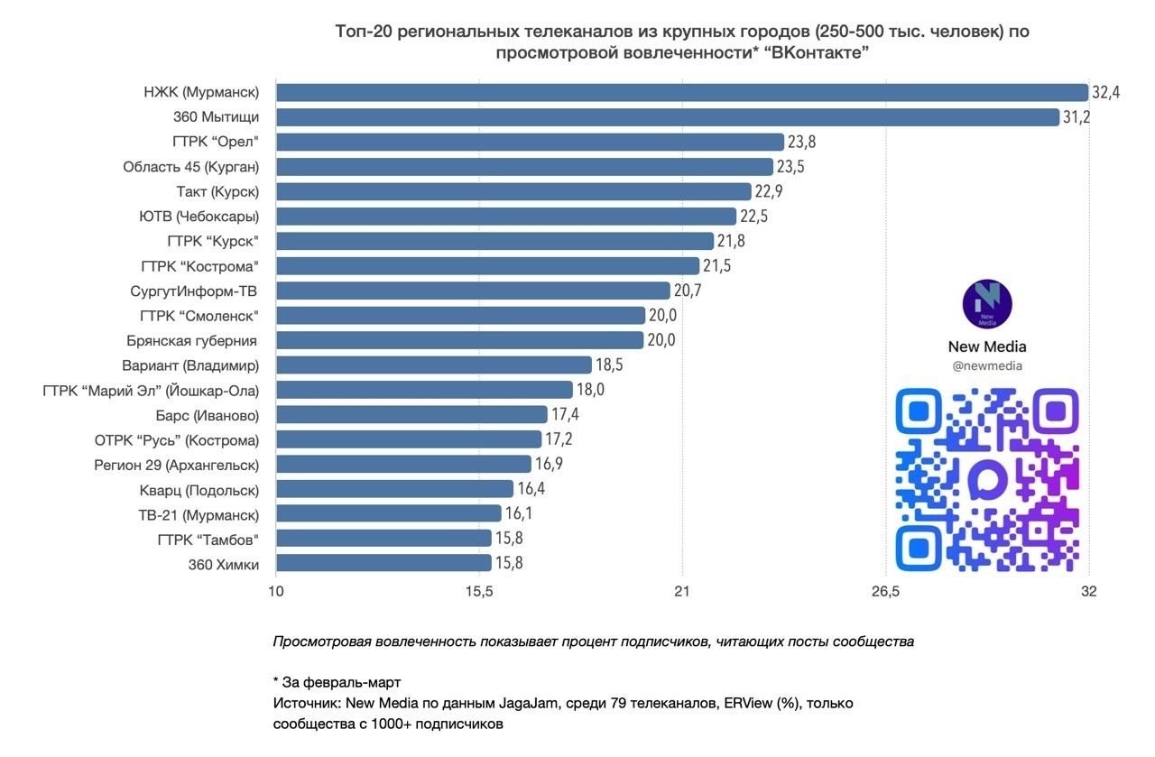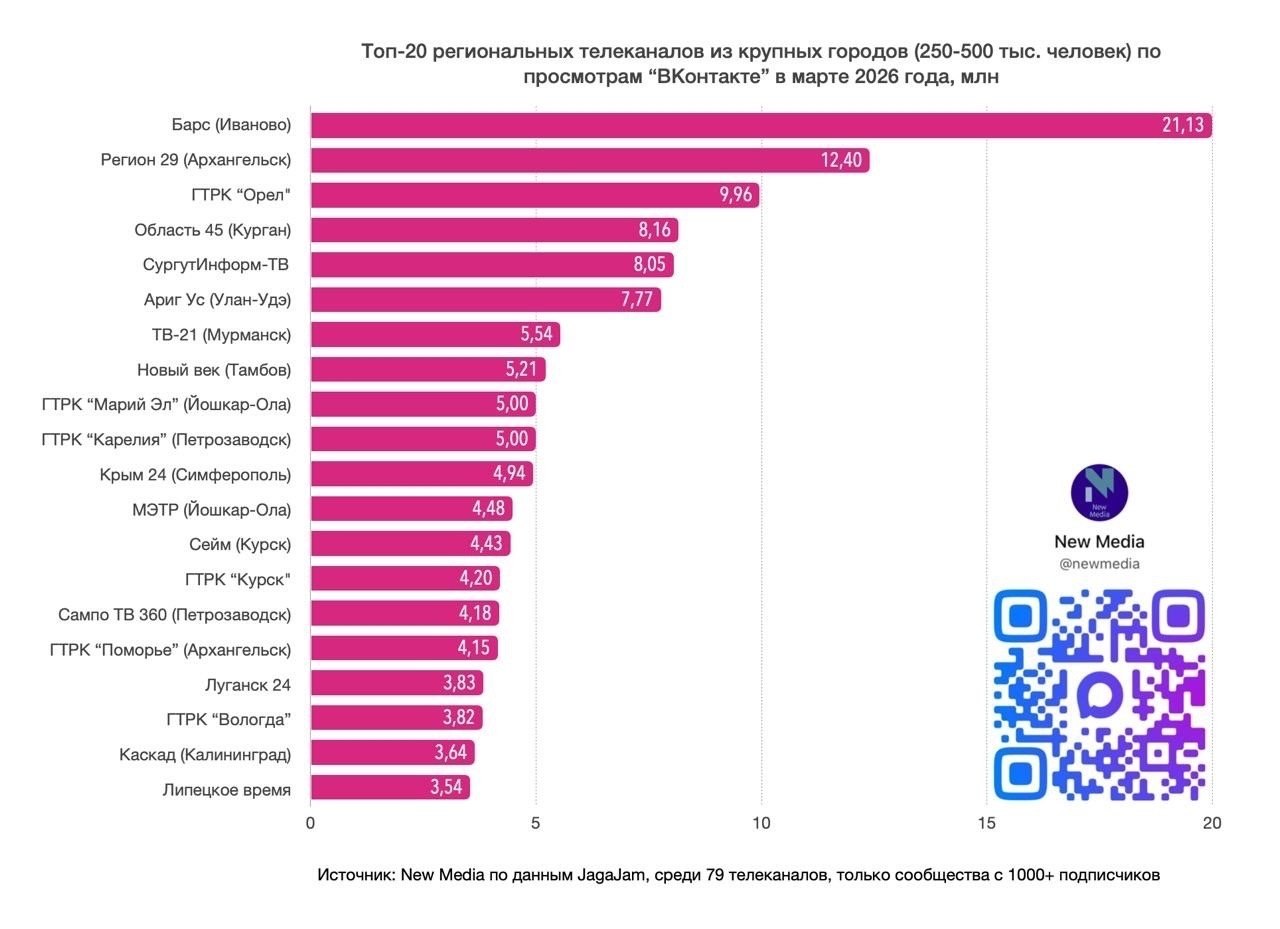 Наше сообщество Телеканал Регион 29 попало в топ-20 телеканалов ВКонтакте в марте 2026 года (в категории городов с населением 250–500 тысяч человек). Мы разместились на 16-й строчке. Но это еще не всё.