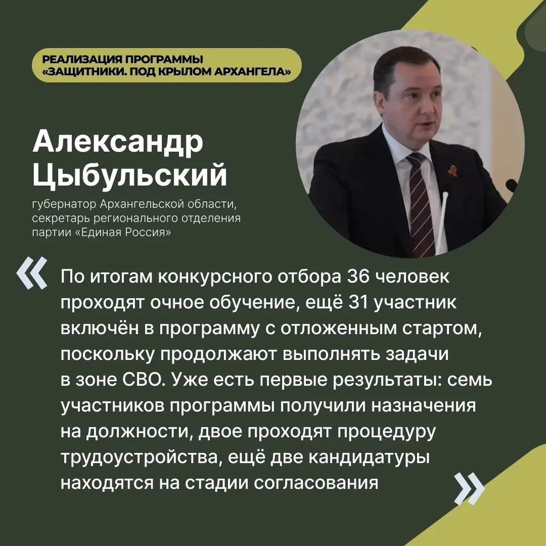 Как подчеркнул глава региона, важнейшая задача — обеспечить бойцам уверенность в том, что дома о них помнят, а их семьи находятся под защитой. Также важным направлением работы стала подготовка военнослужащих к возвращению к мирной жизни. В регионе реализуется программа «Защитники. Под крылом Архангела», ставшая продолжением президентского проекта «Время героев».