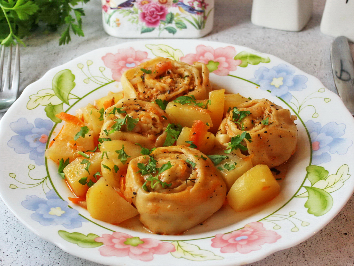 Эти уникальные штрули — полноценный ужин, который стоит попробовать каждому. Здесь нет привычной сладкой начинки и хрустящей корочки, но зато есть невероятная сытность и уютный домашний вкус. Комбинация тонкого теста, сочного фарша, картофеля, моркови, лука и ароматного бульона превращается в сковороде в аппетитное блюдо, от которого сложно отказаться. Это что-то среднее между жарким, пельменями и мясными рулетами — определенно стоит вашего времени!