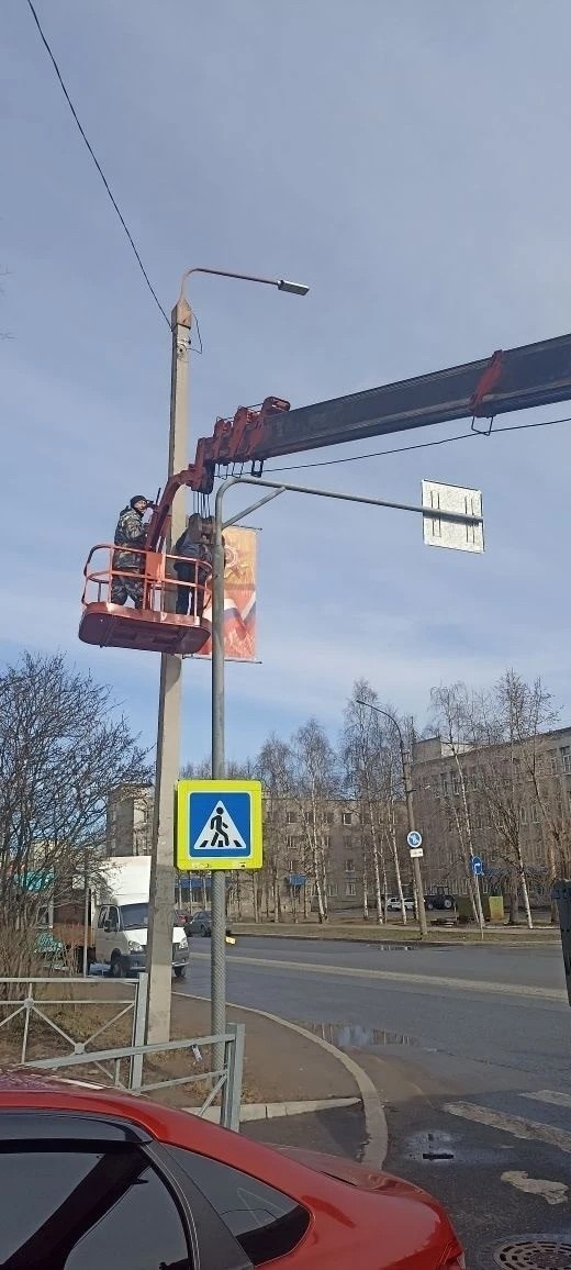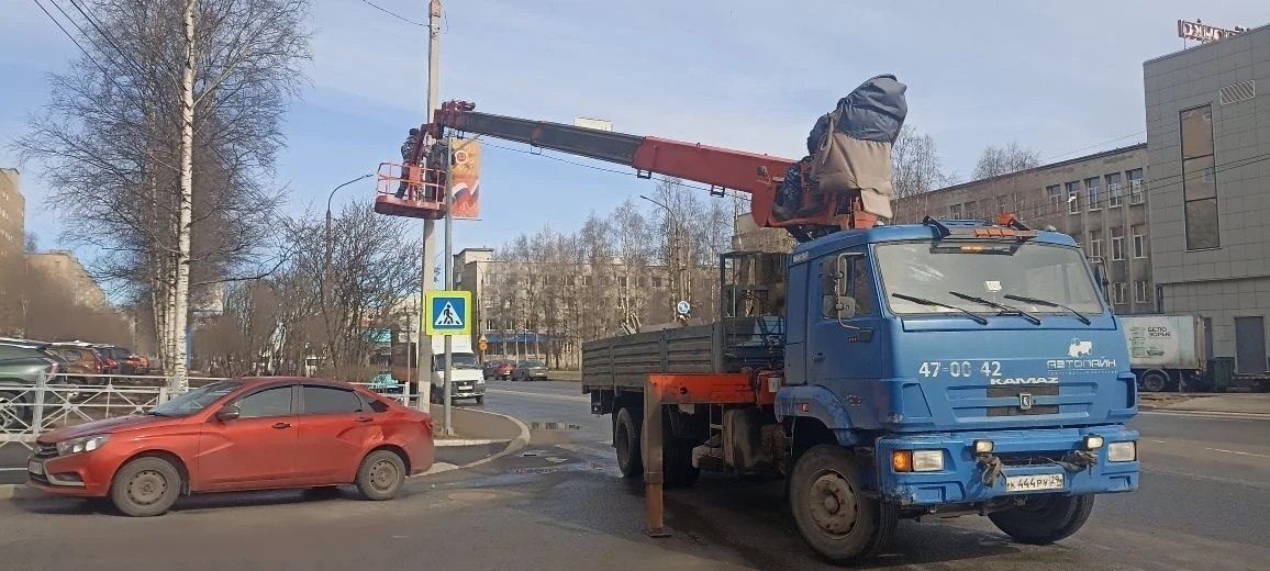 Началось украшение города к Дню Победы: во всех округах развешивают праздничные консоли, флаги и баннеры.